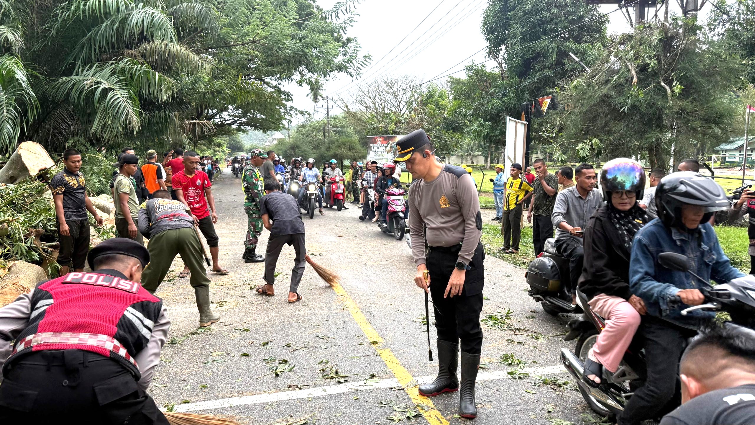 ACEH SELATAN - Kapolres Aceh Selatan Polda Aceh bersama personel gabungan dari Polres Aceh Selatan, Polsek Sawang, personel Yonif 115 dan dibantu oleh masyarakat sekitar yang turun langsung ke lokasi pohon tumbang yang terjadi di depan Kompi Khusus Yonif 115, Kecamatan Sawang, Kabupaten Aceh Selatan. Peristiwa ini terjadi sekitar pukul 15.00 WIB akibat angin kencang yang melanda wilayah tersebut, Sabtu, (7/6/2025).