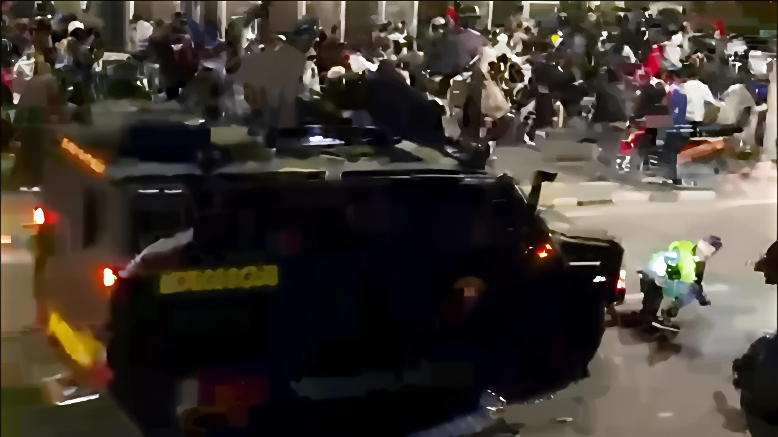 Dalam rekaman yang beredar, mobil rantis bertuliskan “Brimob” terlihat melaju cepat dengan sirine menyala saat membubarkan massa.