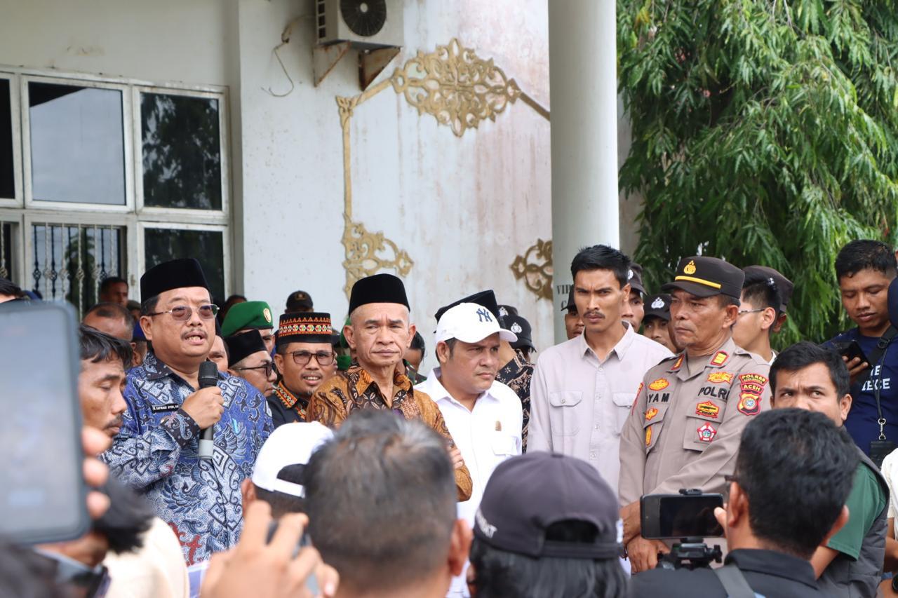 Bupati Aceh Singkil, Safriadi Oyon temui dan dengarkan langsung tuntutan dari massa gabungan aliansi mahasiswa saat melakukan unjuk rasa di kantor Dewan Perwakilan Rakyat Kabupaten (DPRK).Ist