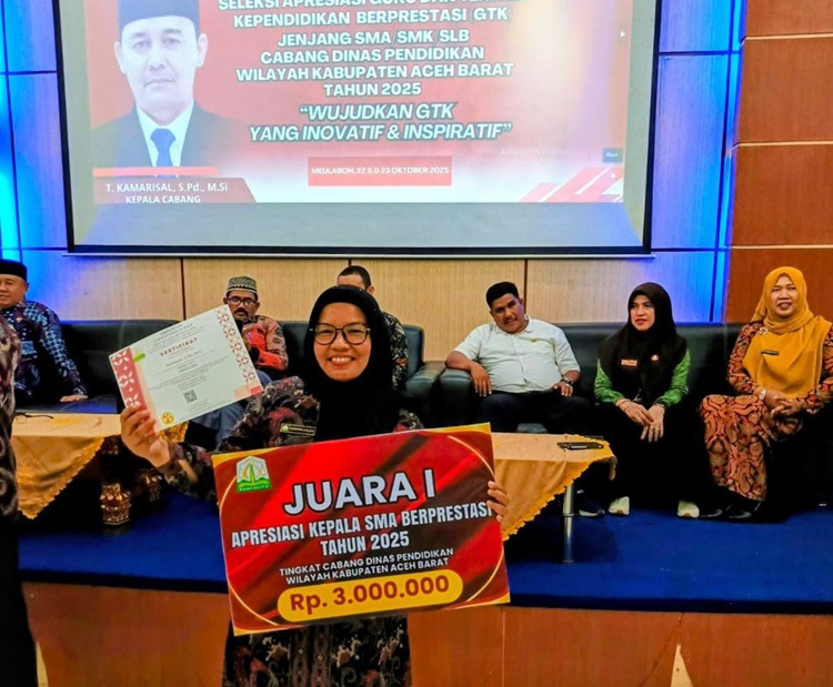 Aceh Barat, Bumpnews.id — Kepala SMA Negeri 1 Woyla, Nurhayani, S.Pd., M.Si, meraih Juara 1 pada ajang Apresiasi Kepala Sekolah Berprestasi Tingkat SMA se-Kabupaten Aceh Barat yang diselenggarakan oleh Cabang Dinas Pendidikan Wilayah Aceh Barat. (Kamis, 23 Oktober 2025)