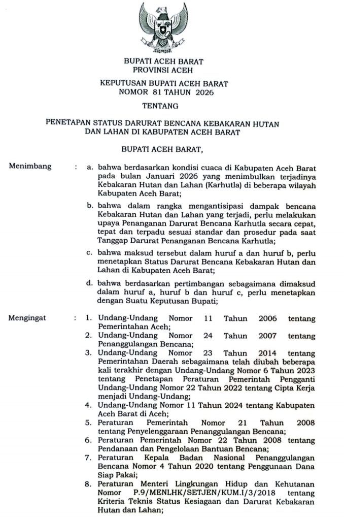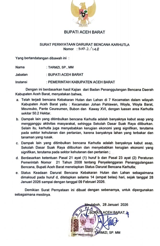 Penetapan status darurat tersebut dituangkan dalam Surat keputusan Bupati Aceh Barat Nomor 81 Tahun 2026 tentang Penetapan Status Darurat Bencana kebakaran hutan dan lahan, juga surat Pernyataan Darurat Bencana Karhutla Nomor 300.2/148 yang ditandatangani langsung oleh Bupati Aceh Barat, Tarmizi, SP, MM, pada 28 Januari 2026 di Meulaboh, berdasarkan hasil kajian Badan Penanggulangan Bencana Daerah (BPBD) setempat.