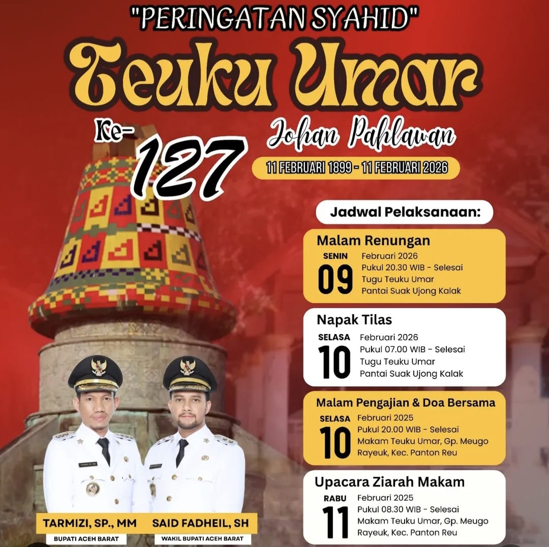 “Peringatan Syahidnya Teuku Umar ke-127 tahun ini dilaksanakan melalui beberapa agenda utama yang dipusatkan di sejumlah lokasi bersejarah,” ujar Kurdi, Minggu (8/2/2026).