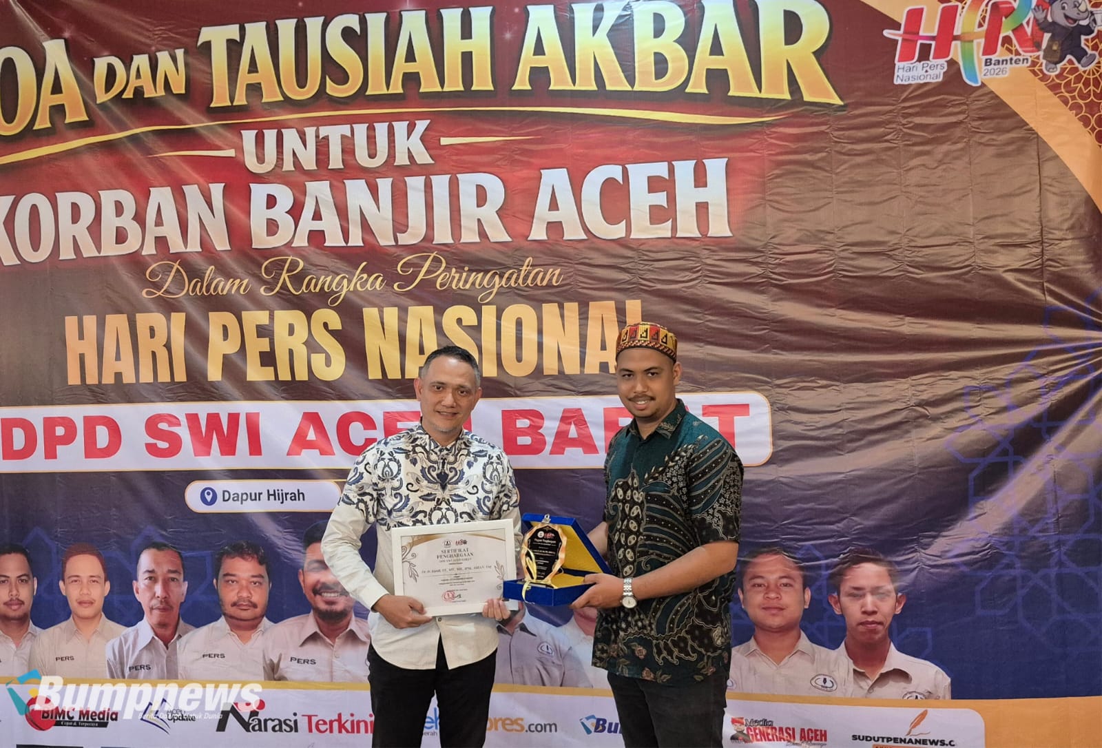 ACEH BARAT | BumpNews.ID – Dewan Pimpinan Daerah Sekretariat Bersama Wartawan Indonesia (DPD SWI) Aceh Barat menyerahkan sejumlah penghargaan dalam rangka peringatan Hari Pers Nasional (HPN) 2026.