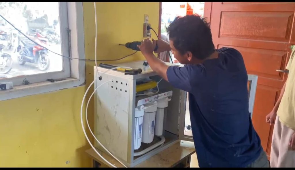 Pemasangan alat dilakukan langsung oleh tim dosen dan mahasiswa sebagai bentuk kepedulian terhadap kebutuhan air minum layak bagi para pengungsi.