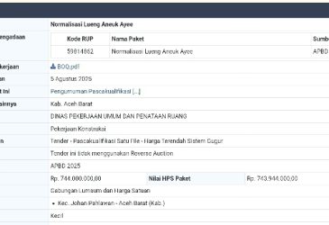 ACEH BARAT – Pemerintah Kabupaten Aceh Barat melalui Dinas Pekerjaan Umum dan Penataan Ruang (PUPR) kembali menuntaskan salah satu proyek strategis bidang infrastruktur, yakni pembangunan…